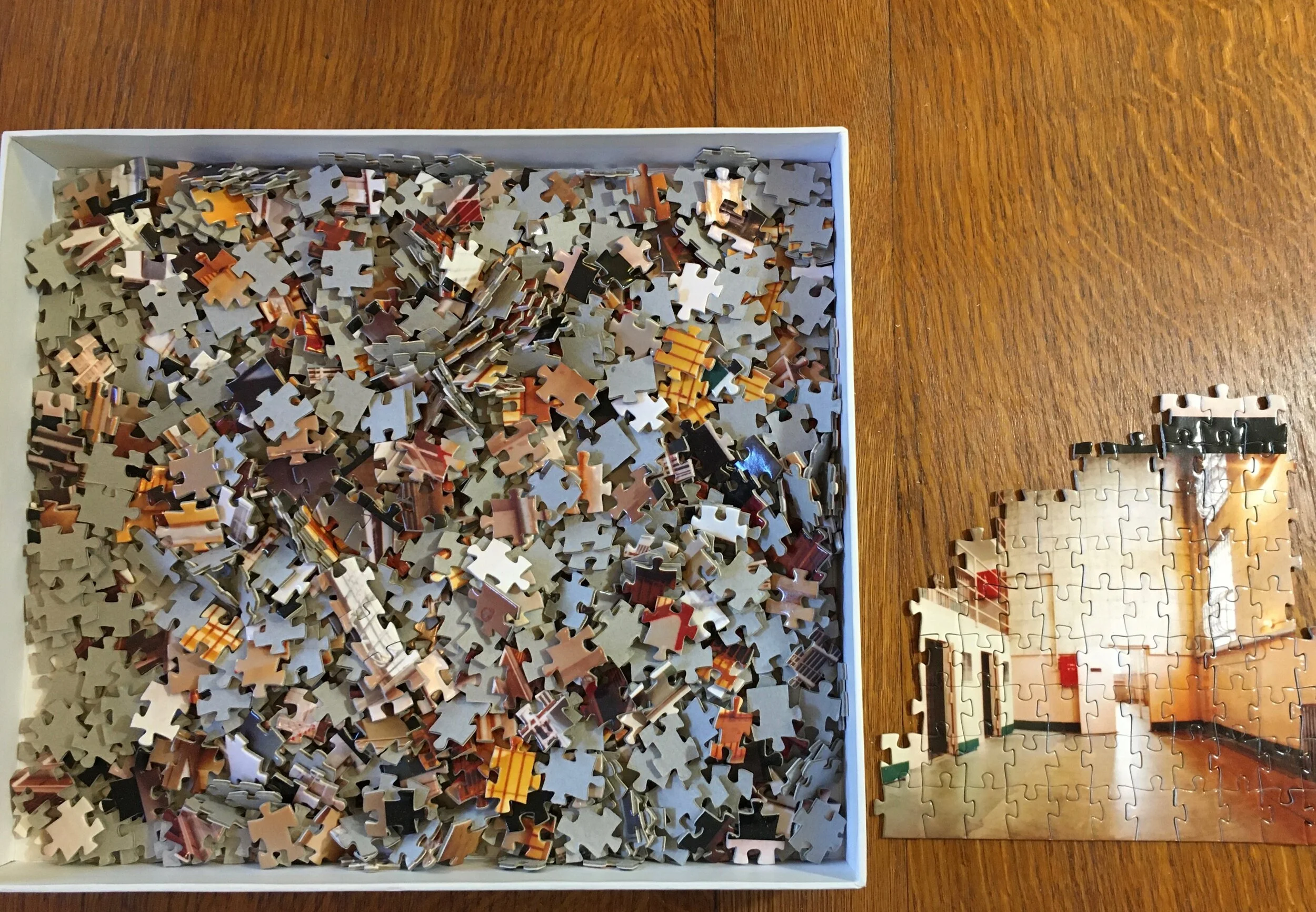 I do jigsaw puzzles the way I used to stage manage. Everything organized just so. Find this one piece. No distractions. As I worked this puzzle, I became calm as I couldn’t overthink the possible collapse of human civilization. That’s a hell of a weight we’re all carrying around in our fragile heads. No wonder we need puzzles.