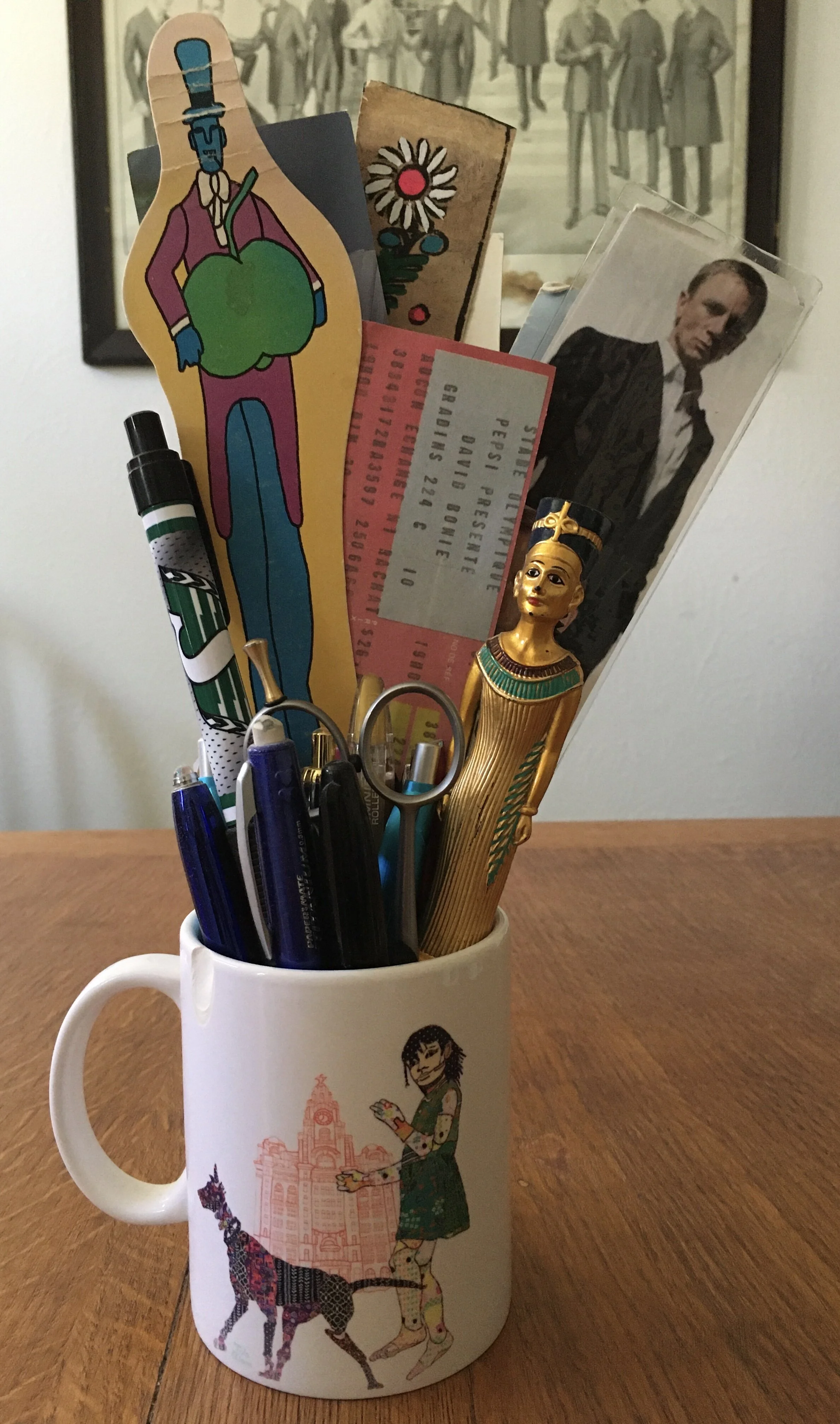 Stu and I went to Liverpool in the summer of 2014 to see the Giant Puppets that hugely influenced the characters in my sixth book, Nuala: A Fable. I bought this mug at the gift shop down at the Liver Building and for seven years, it’s been my wine-sipping receptacle of choice. Until I cut my lip on it and realized it had a huge chip. This one caused me real pain. That trip was … I’ll just exaggerate and make clichés if I try to describe it. I had some meaningless mug full of pens and bookmarks on my desk. I gave that one away, and replaced it with this. Now I can see Little Girl Giant and her dog Xolo any time I like, even though I can no longer drink from that mug.