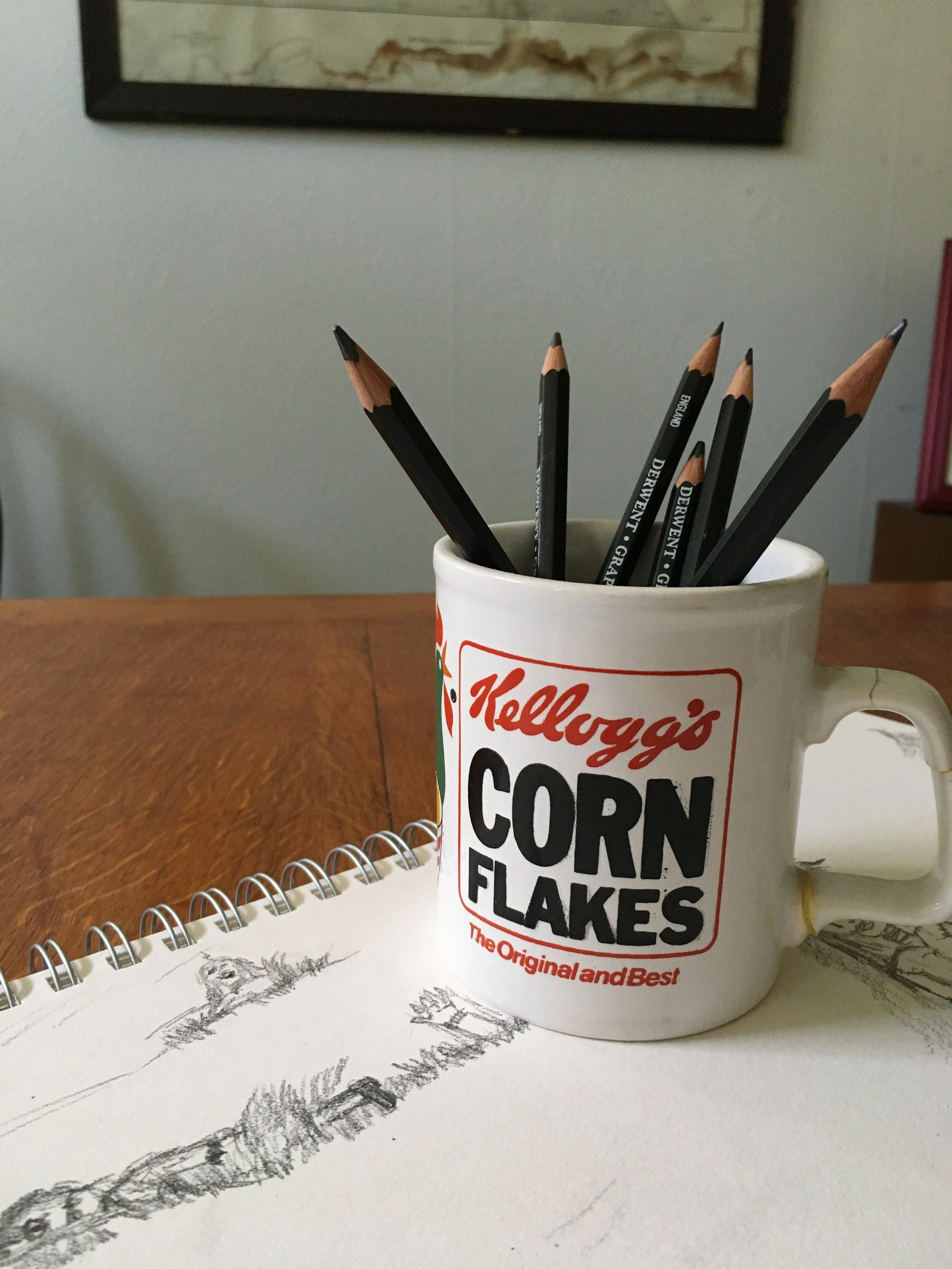 I have a faint memory of that as my favourite mug while I was there, and I imagine he gave it to me because he’d noticed. I’ve not been able to drink anything out of it for decades. Have you ever seen such a busted handle? Now I use it to hold my drawing pencils, as it’s so much easier to pull them out of the mug than dig them out of the case they came in.